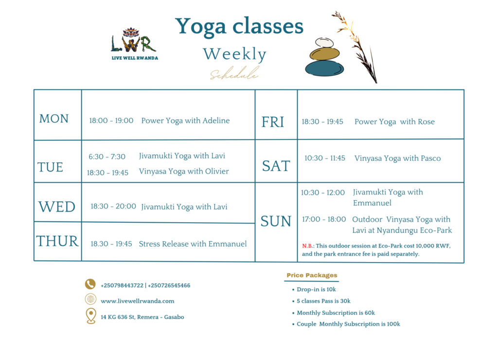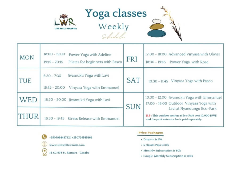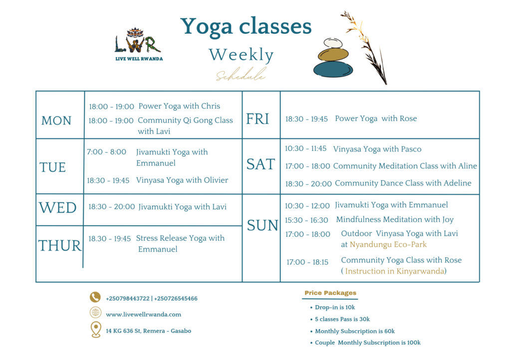 Book your class Hello there! Welcome to our booking page. Please start by choosing the location and proceed. Thank you!If you face any challenge, please reach out to +250798443722 or via email: livewellrwanda@gmail.com.